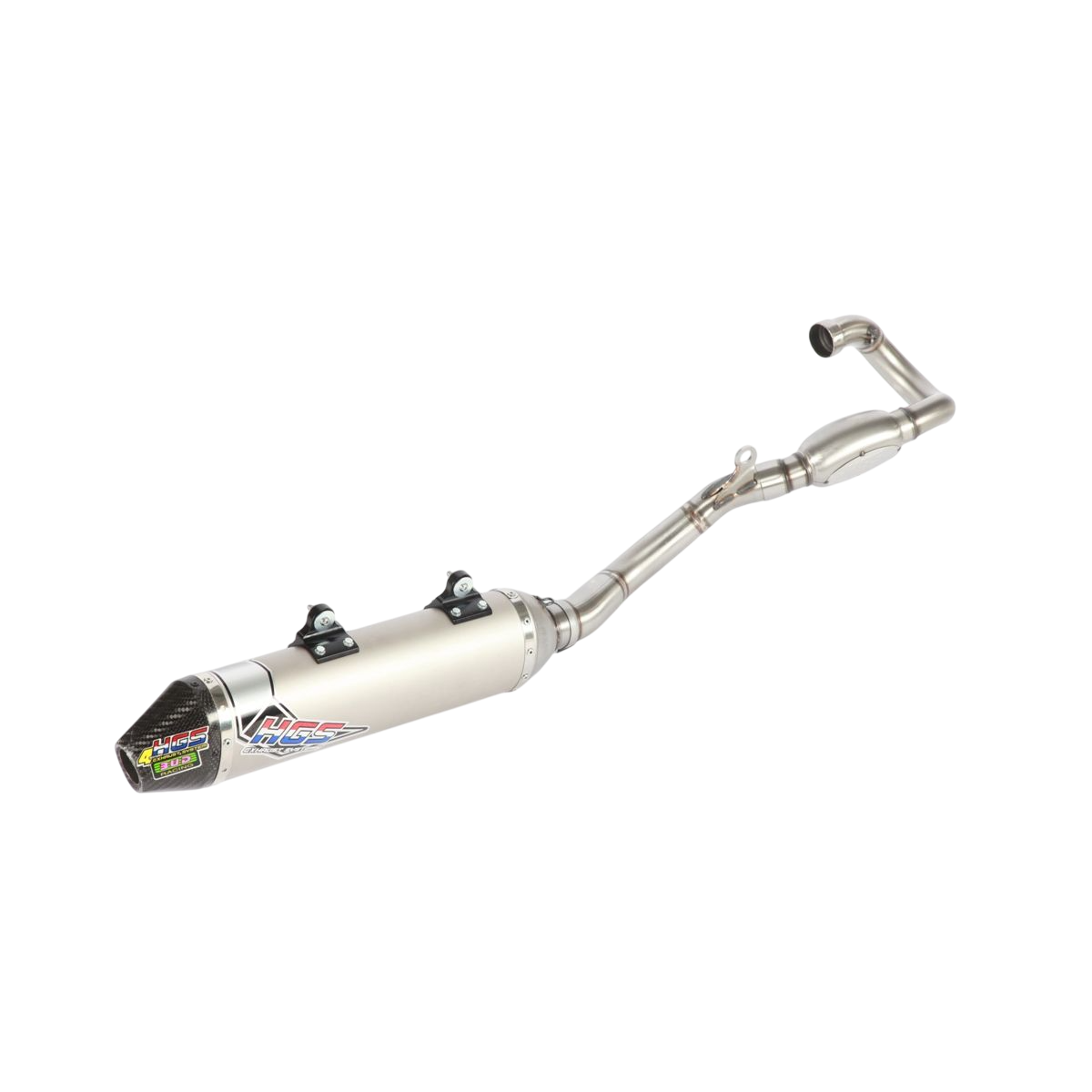Ligne d'échappement complete HGS/Bud racing 4 temps. Les pots HGS/Bud 4t sont testés au banc et sur circuit avec l'aide de nos meilleurs pilotes. Ils sont en inox-alu-carbone alliant fiabilité et poids minimum. Le collecteur bénéficie de la 'bombe' pour réduire le bruit et améliorer l'acceleration à bas régime. Les lignes sont aux normes de bruit réglementaires FFM & FIM. https://www.youtube.com/watch?feature=player_embedded&v=cFFKZkpezJY