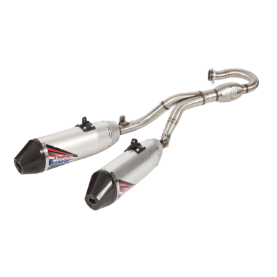 Ligne d'échappement complete HGS/Bud racing 4 temps. Les pots HGS/Bud 4t sont testés au banc et sur circuit avec l'aide de nos meilleurs pilotes. Ils sont en inox-alu-carbone alliant fiabilité et poids minimum. Le collecteur bénéficie de la 'bombe' pour réduire le bruit et améliorer l'acceleration à bas régime. Les lignes sont aux normes de bruit réglementaires FFM & FIM. https://www.youtube.com/watch?feature=player_embedded&v=cFFKZkpezJY