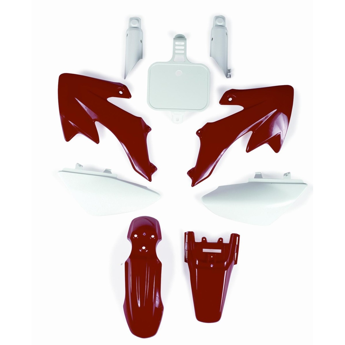 Kit plastique CRF 50 style pour pitbikes. La plaque avant et latérales sont toujours blanches sauf pour les chrome et silver.
