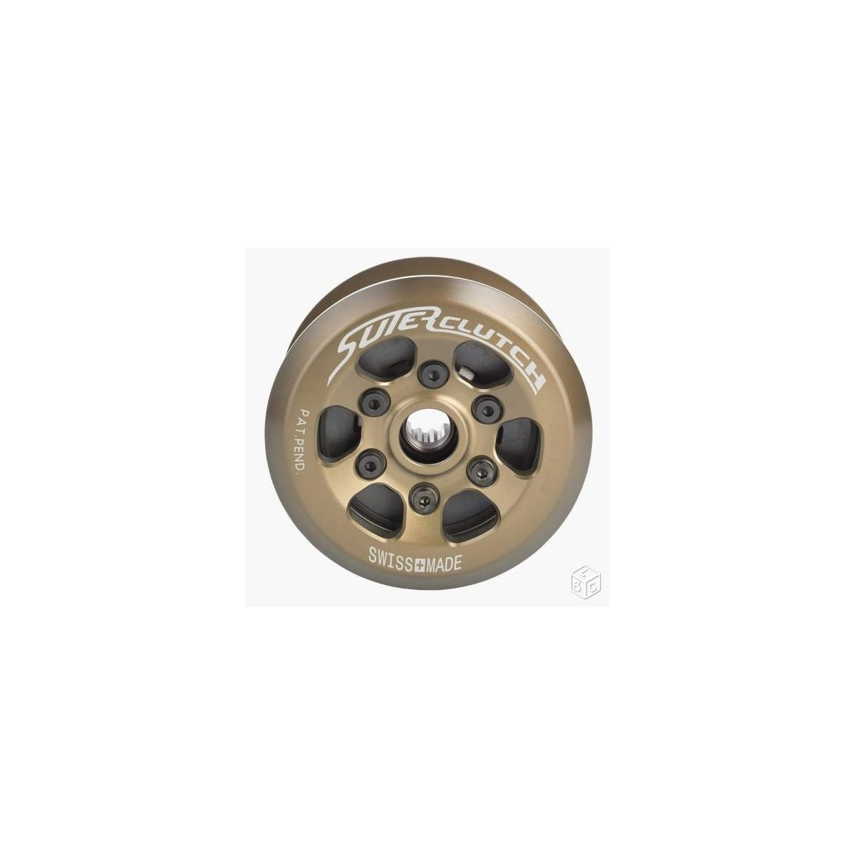 Kit complet embrayage SUTERCLUTCH anti dribble. Ce systeme d'embrayage breveté est utilisé au plus haut niveau de la compétition moto, que ce soit en Moto GP, Superbike ou MXGP. Les meilleurs Teams utilisent l'embrayage Suter BTL pour de meilleurs départs, un meilleur controle de la moto et une longévité des disques d'embrayages fortement augmentée. Sur l’embrayage Suter, les ressorts classiques sont remplacés par des membranes ressort, la cage intérieure n’est pas déplacée de manière axiale par l’amalgame des rondelles soumises à l’effort (seul le plateau de pression subit une levée), elle est pratiquement exempte de frottements, ce qui assure une réponse plus fine. On peut également ajuster le frein moteur si nécessaire. La cage interne ainsi que les plateaux de base et de pression sont en alu hautement durci, muni en plus d’une couche hyperdure anodisée contenant du téflon, afin de réduire l’usure à son minimum. Le SuterClutch s’adapte à l’ensemble des disques d'embrayage d’origine. Afin que chacun puisse régler son anti-driblbe en fonction de son pilotage. De la même manière, le démontage et le remontage des embrayages anti-dribble SuterClutch ne nécessitent aucun outil spécifique à acheter séparément et reste simple. Utilisé en MXGP par Gautier Paulin, Arnaud Tonus (Wilvo Yamaha) Brian Moreau, Mitchell Harrison (BUD racing Kawasaki) Darian Sanayei (Team Dixon racing), Alessandro Lupion (Gebben)...